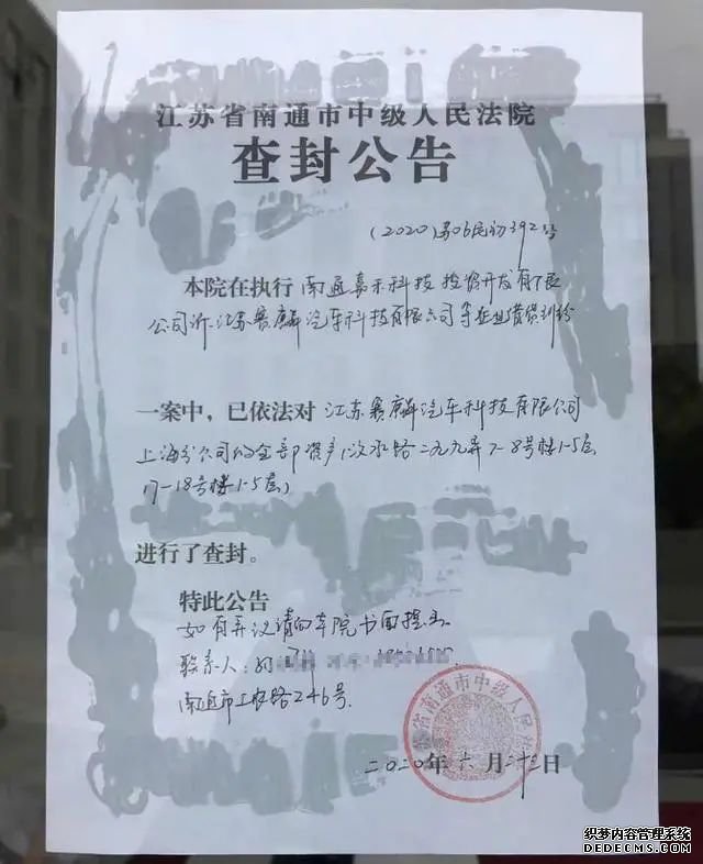 查封公告顯示,江蘇省南通市中級人民法院在執(zhí)行南通嘉禾科技投資開發(fā)有限公司訴江蘇賽麟汽車科技有限公司企業(yè)借債糾紛一案中,已依法對江蘇賽麟汽車科技有限公司上海分公司的全部資產(chǎn)進行了查封。